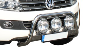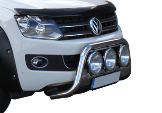 You can find similar products hereLow bull bar in highly polished stainless steel for VW Amarok from 2011-. Space for three auxiliary lights (235 mm) that provide a proper high beam, and a great impression from the front!