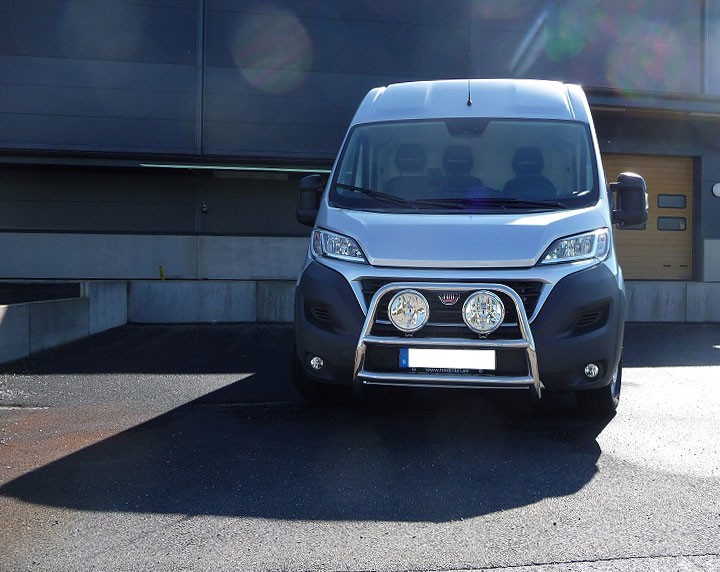 Stainless steel bull bar with two ready-made brackets for mounting extra lights. The highly polished surface treatment gives your Peugeot Boxer from 2014 - a stylish, chrome shiny look!