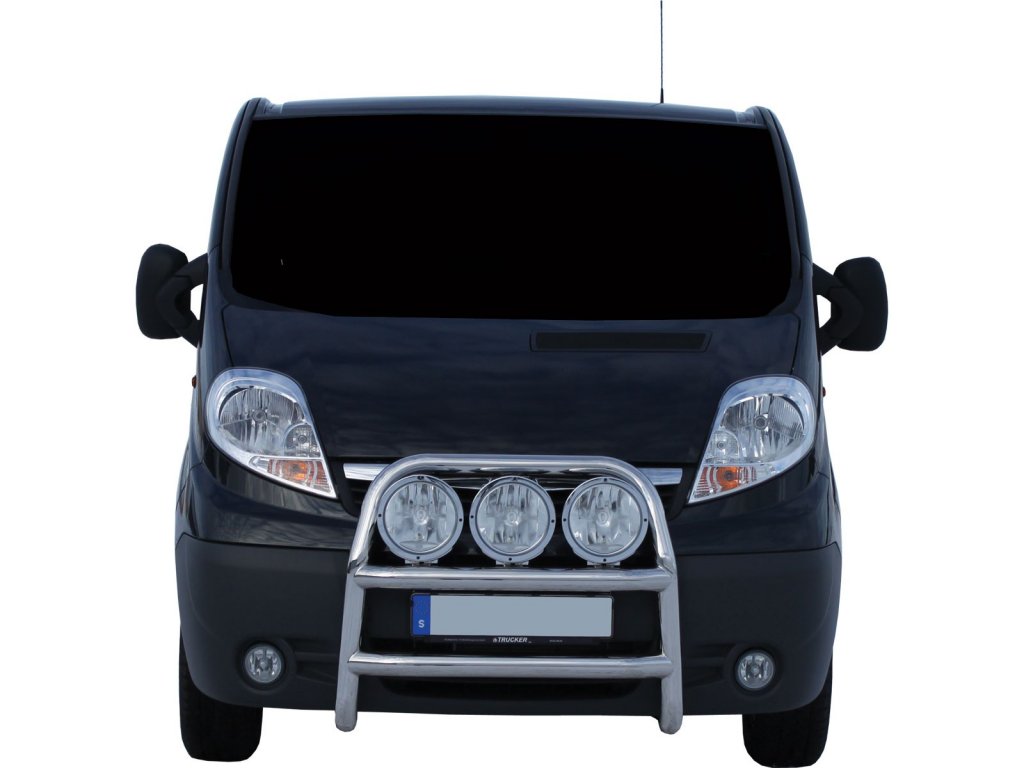 You can find similar products hereStylish high stainless steel bull bar for Renault Trafic from 2002-2014 with space for three extra lights. The finish is available in two versions, choose which you want from the list above.