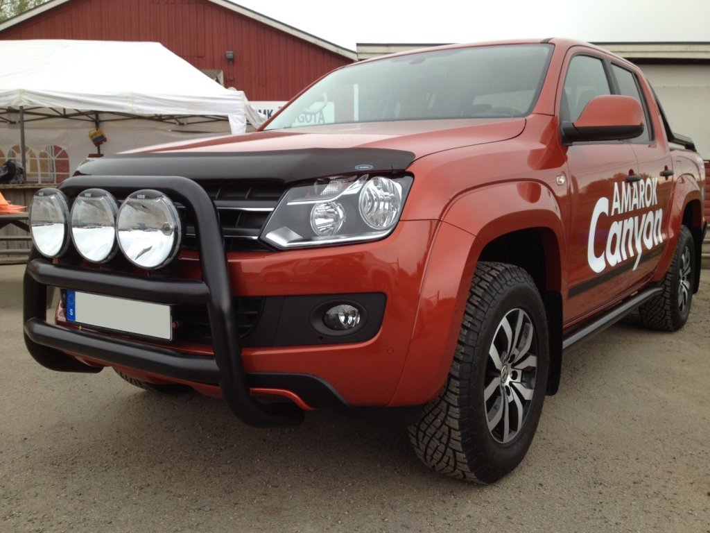 Large and tough bull bar in highly polished stainless steel, painted black, designed for VW Amarok from 2011-. Space for three full-size auxiliary lights gives a proper high beam, and a great impression from the front!
