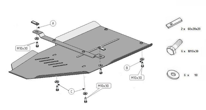 Skid Plate Toyota Land Cruiser 150 from 2010- is designed to protect the engine, radiator and gearbox from damage. Installation is very easy, as the Toyota Land Cruiser 150 Skid Plate is mounted in the original mounting points on your car. The installation takes place without any damage to your car and can be restored to original design if desired.