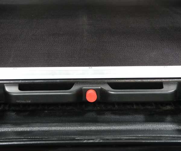 The cargo sled has a metal frame with cargo loops all around and a composite wood base. At the rear is a handle with a button that unlocks the cargo sled. When you release the button, it locks at the nearest point.