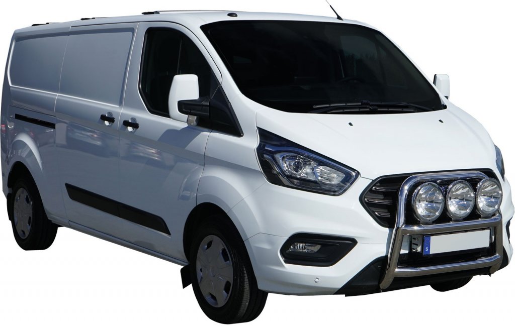 Our Ford Custom bull bar is Swedish-designed with sought-after features. Fixed attachment points for auxiliary lights where the heavy-duty auxiliary light ears allow you to mount auxiliary lights without top brackets. The bull bar is designed to fit snugly against the front of the car, while being adjustable for positioning to suit your taste.