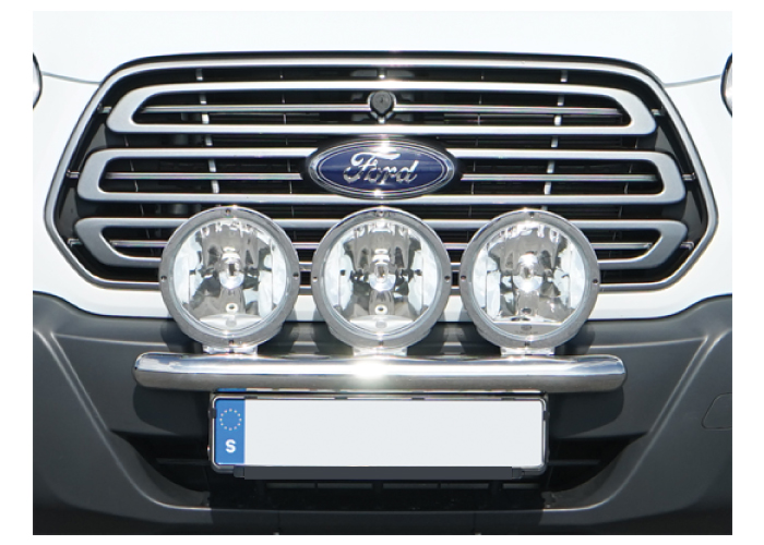 The Ford Transit auxiliary light bracket accommodates three full-size auxiliary lights (235 mm). The attachment points for the auxiliary lights are recessed into the arch tube and allow you to adjust the depth. The bracket is also height adjustable to provide freedom of choice in placement. Our Ford Transit auxiliary light mount is designed to sit snugly against the front of the car, while being adjustable for placement to suit your taste.