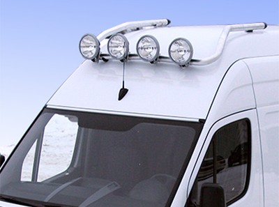 Functional front roof bar made of aluminum with natural anodized surface treatment, which gives the bar a silver matte surface. Specially designed for Mercedes-Benz Sprinter H3 from 2006-2018, for those who want a proper high beam!