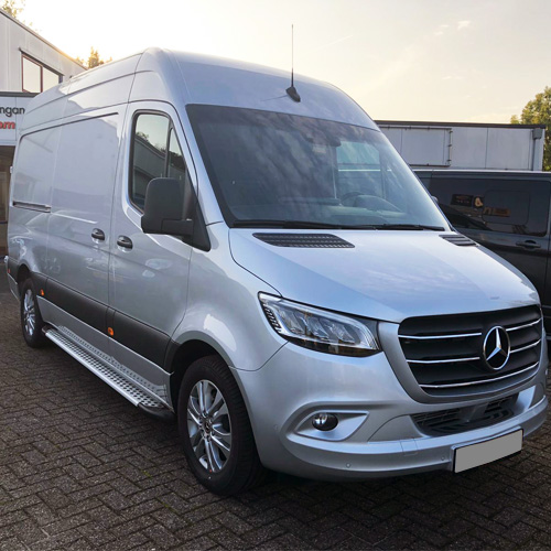 Stylish and practical side steps Mercedes Sprinter from 2018 onwards. The side steps are made with an aluminum core, brushed aluminum as a step surface with anti-slip rubber and end caps in ABS plastic.