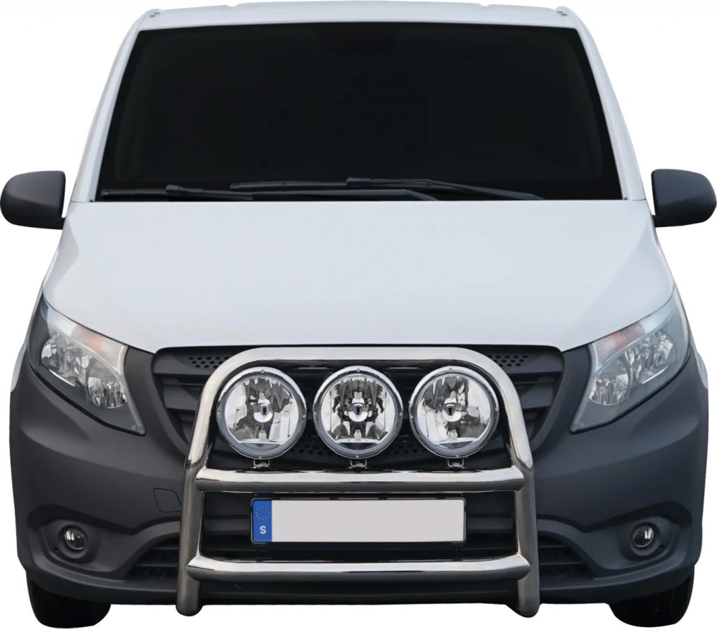 Our Mercedes Vito bull bar is Swedish-designed with sought-after features. Fixed attachment points for auxiliary lights where the strong auxiliary light ears allow you to mount auxiliary lights without top brackets. The Mercedes Vito bull bar is designed to fit snugly against the front of the car, while being adjustable for positioning to suit your taste.
