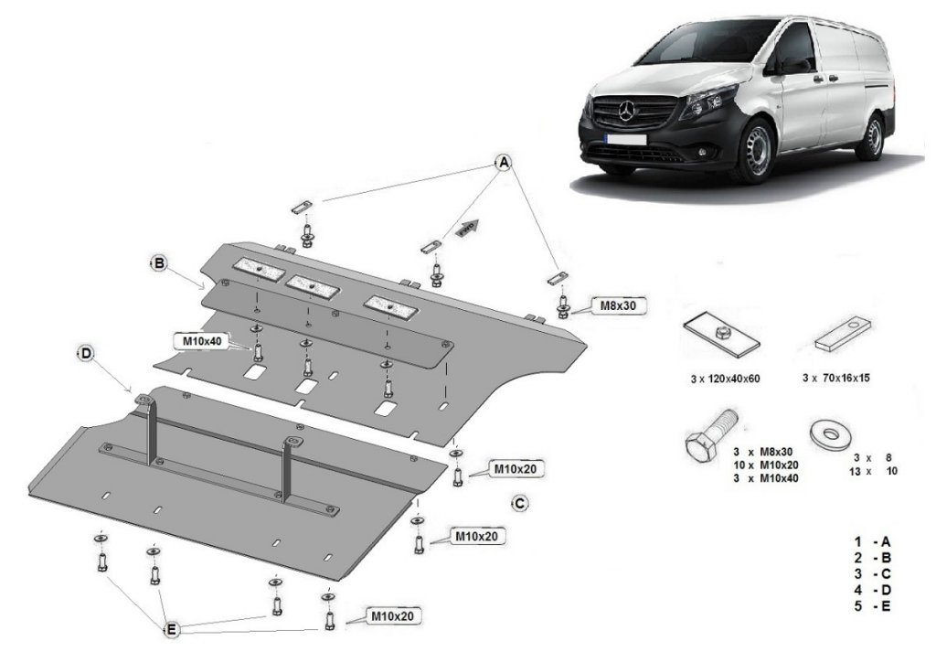 The Mercedes Vito skid plate is delivered individually together with assembly parts and assembly instructions.
