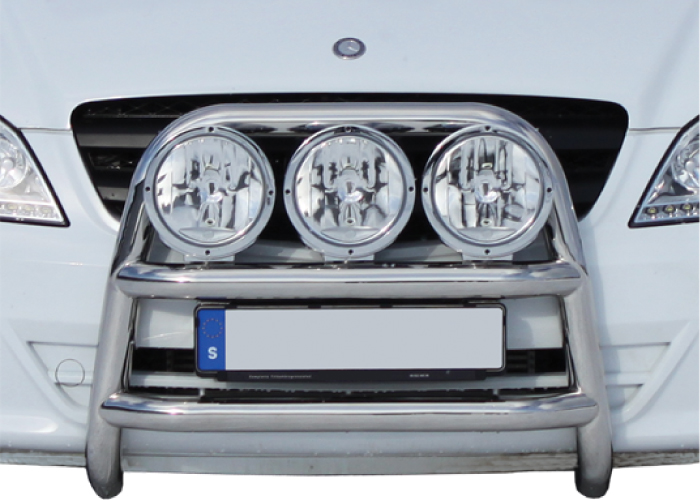 You can find similar products hereStylish high bull bar in highly polished stainless steel, designed for Mercedes-Benz Vito/Viano from 2011-2014. Space for three auxiliary lights with fixed brackets, for those who want to give the car a proper high beam and a great impression from the front! High-gloss polished finish, for a shiny chrome finish.