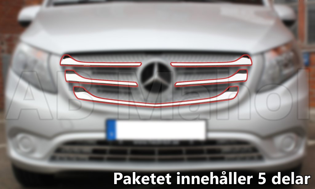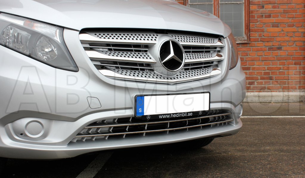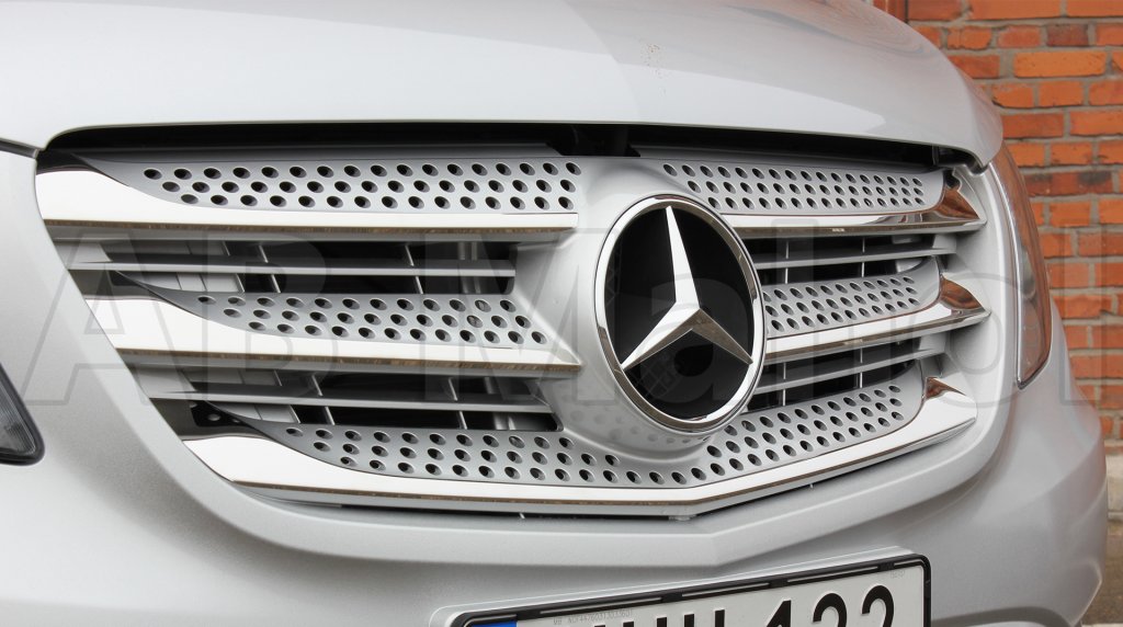 Stylish grill details for mounting on the original grill for Mercedes Vito from 2015-2020. The grill is made of stainless steel with a highly polished surface treatment, which gives the grill a shiny shiny look like chrome!