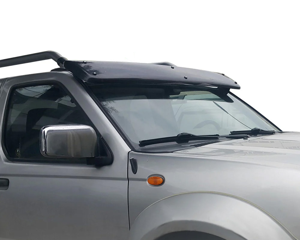 - Sun visor Nissan Navara is installed using the accompanying installation kit. The powder-coated steel mounting parts are screwed into the car's A-pillars for a stable installation. The plastic part of the sun visor is then mounted in the mounting details with bolts, washers and nuts, and finished with a high-gloss black cover in the same material as the sun visor to cover the screws.