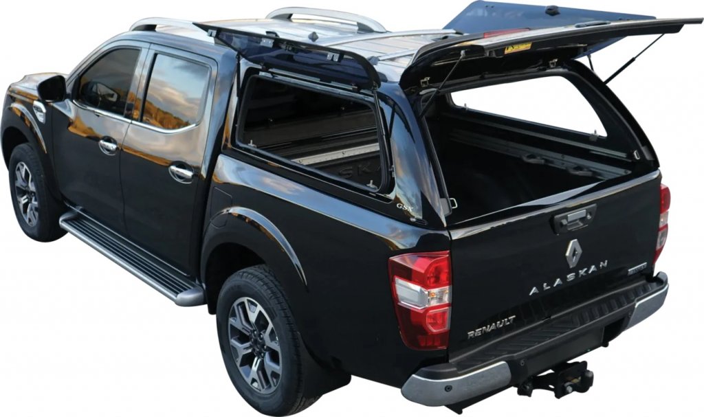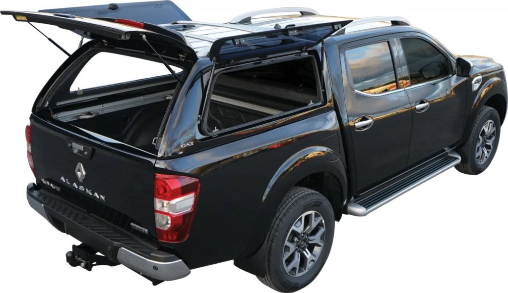 You can find similar products hereThe Alpha GSX canopy is cabin high and has opening side windows. Produced for Renault Alaskan (Double Cab) from 2017-2019.