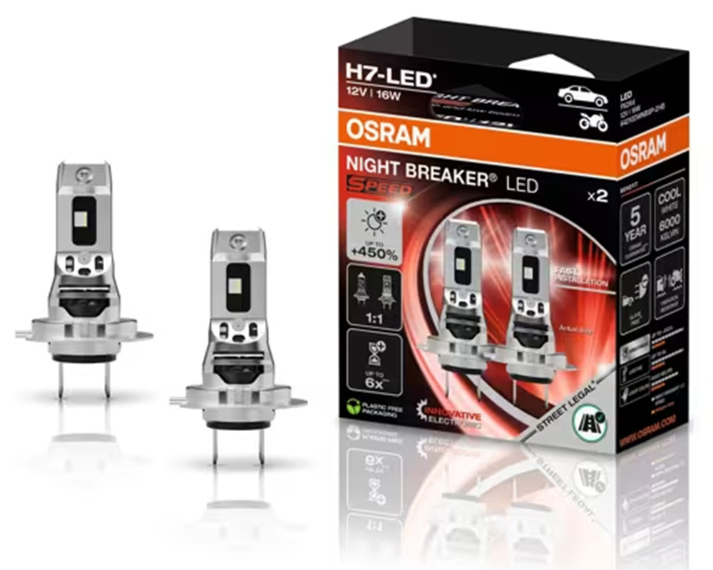 Swap halogen for the future. With the Osram Night Breaker LED SPEED H7 Renault Master, you get a durable, energy-efficient, and extremely powerful lighting solution, delivered in plastic-free packaging.