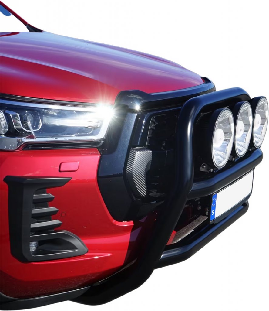 This bull bar is specifically designed for the Toyota Hilux, ensuring a tight and stylish fit that follows the natural lines of the car. The discreet yet powerful design blends perfectly with the car's exterior without giving an oversized impression. Under the horizontal cross tube, there is an integrated license plate holder bracket, making installation simple and easy without compromising on design.