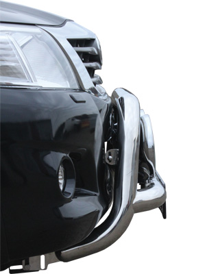 Bull bar with sought-after features, such as fixed attachment points for auxiliary lights. Heavy-duty auxiliary light ears allow you to mount auxiliary lights without top brackets. The Hilux bull bar is designed to fit snugly against the front of the car, while being adjustable for positioning to suit your taste.