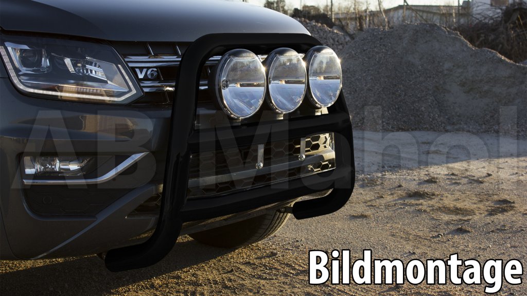 Large practical and stable stainless steel bull bar with a matte black powder coating, specifically designed for the 2017 Volkswagen Amarok V6 for easy installation and optimal fit. Space for three full-size auxiliary lights provides a proper high beam, and a great impression from the front!