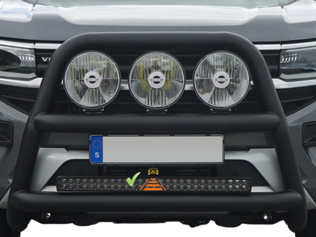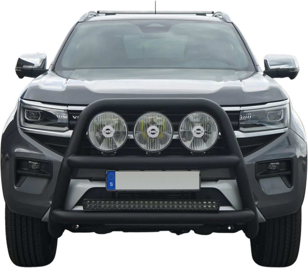 The bull bar has space for three full-size auxiliary lights (235 mm). The attachment points for the auxiliary lights are recessed into the bull bar tube and allow you to adjust the depth. The bar together with the auxiliary lights gives your Amarok a proper high beam, and a great impression from the front!