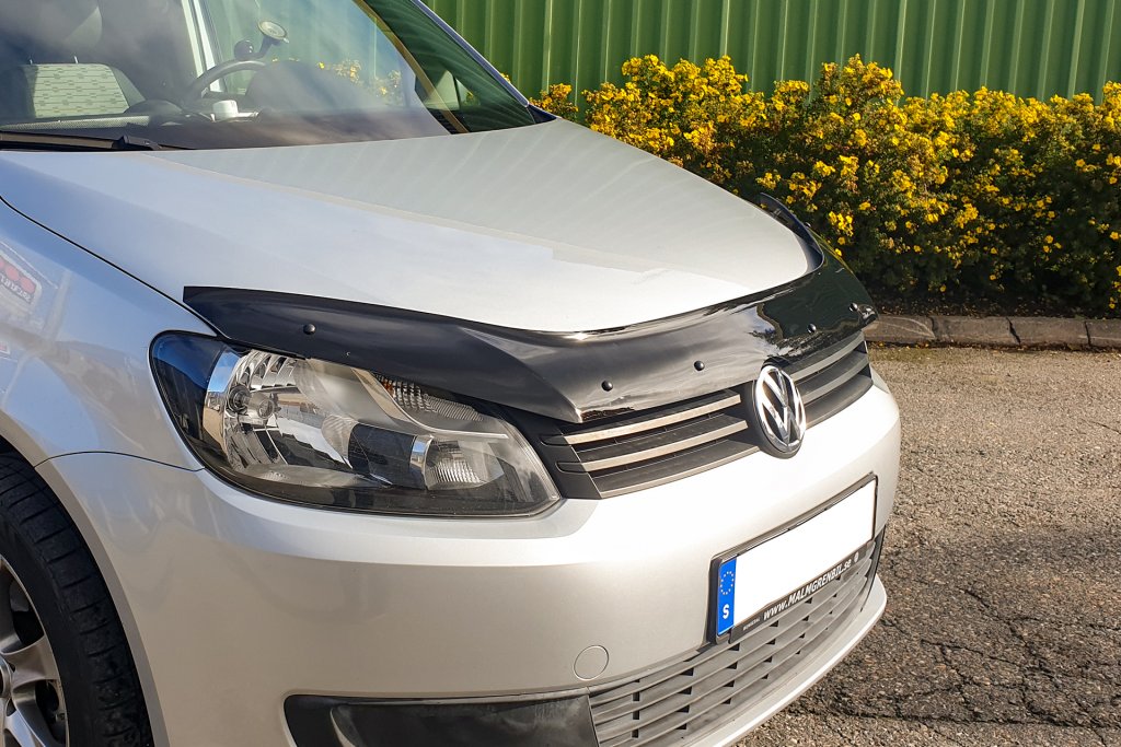 - The assembly is completely non-invasive, where the Bonnet guard Volkswagen Caddy is mounted with the associated felt-covered clamp brackets that are mounted on the hood. The Bonnet guard is then screwed into the clamp bracket, and finished with a high-gloss black cover in the same material as the Bonnet guard to cover the screw.