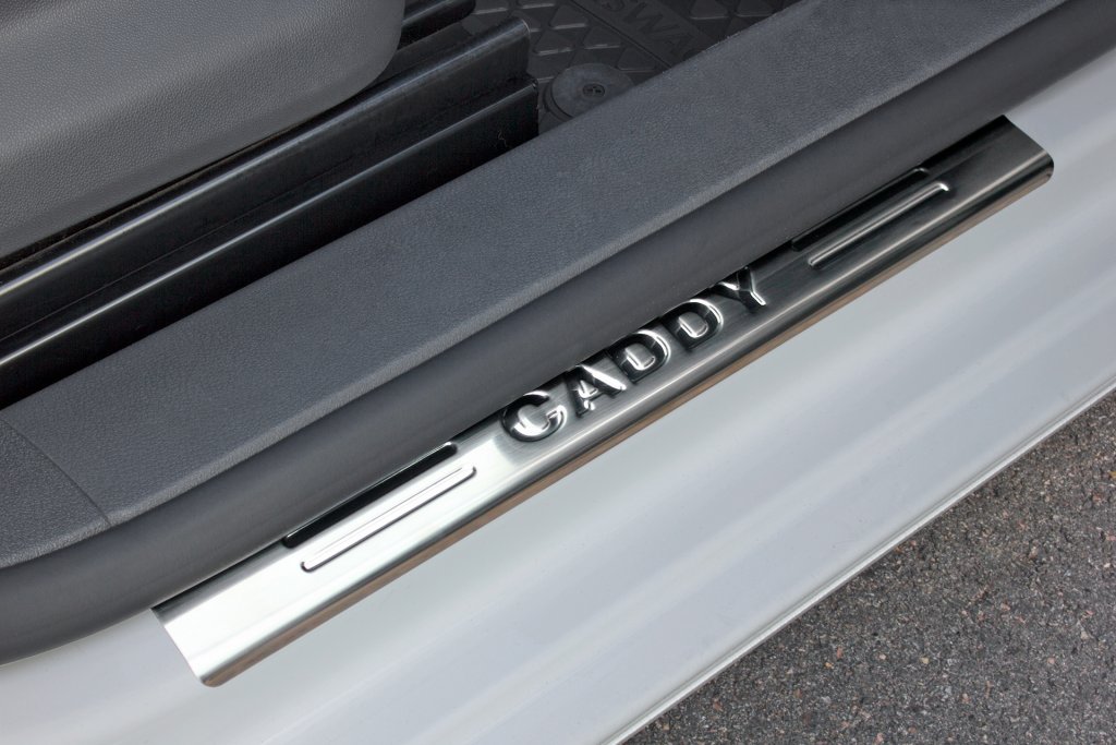Stylish functional door sill protectors in stainless steel, for mounting on the sills of the respective doors. For Volkswagen Caddy from 2004-2020. The surface treatment is high gloss polishing, which gives a clean chrome shine!