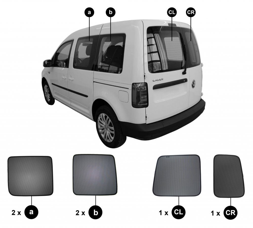 Volkswagen Caddy sun visors are supplied as a complete set for the rear doors, side windows in the boot and boot lid.