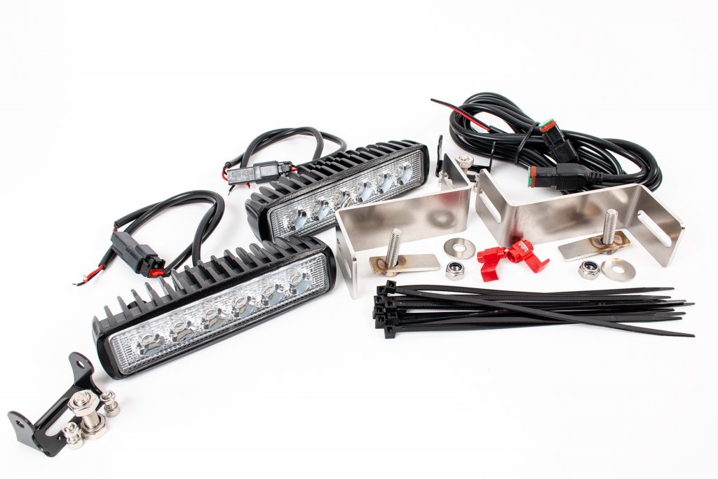 Complete package with extra reversing lights for Volkswagen Caddy from 2016-2020. The package contains LED rear lights together with mounting details for installation under the rear bumper on the right and left sides.