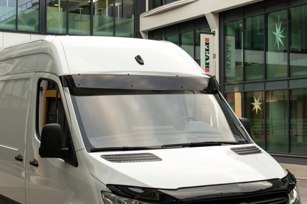 Give your Volkswagen Crafter a stylish upgrade while fighting the sun's strong rays and glare. This aerodynamically shaped sun visor is made of solid, high-gloss black ABS plastic and is securely mounted with powder-coated steel parts in the car's A-pillars. The result is a complete solution that improves both comfort and the design of your car.
