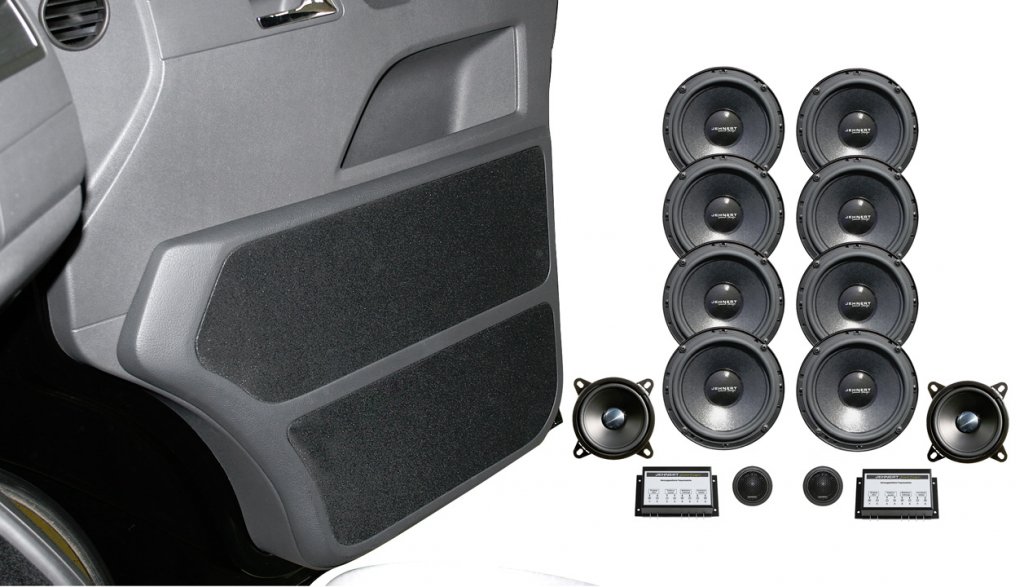 You can find similar products hereStylish additional part for the door side where each door includes 4 extra bass speakers (6.5 "), 1 extra midrange speaker (4") and 1 treble speaker (1"). Developed package for Volkswagen Transporter T5, and fits from year model 2003 and also the facelift model from 2010-2015.