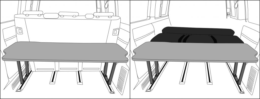 One of the main benefits of this parcel shelf is its flexibility. When the three-seater sofa is folded down, the shelf's surface aligns perfectly with the sofa's backrest. This smart design creates a large, completely flat surface in your Volkswagen Transporter T7, which is ideal for placing a mattress. You can now transform your vehicle into a comfortable sleeping space, perfect for spontaneous getaways and camping adventures.