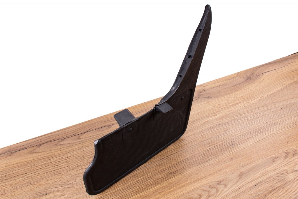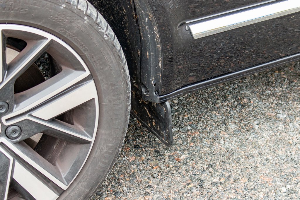 Installation of the mud flaps requires drilling holes in the plastic bumper. The mudguards are mounted with two screws under the bumper and a guide pin to hold the mudguard in place.