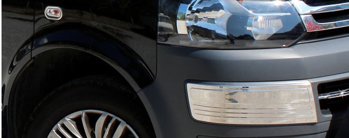 You can find similar products hereStainless steel bumper corners, for mounting on top of the front bumper corner markings on VW Transporter T5 from 2010-2015.