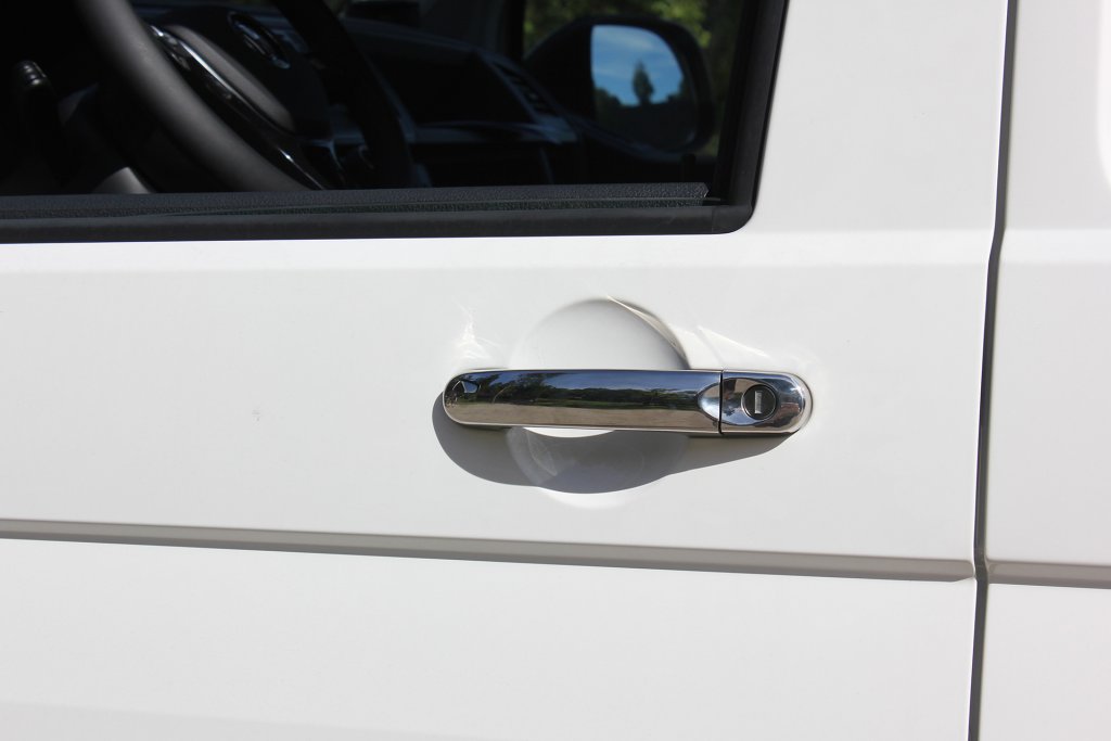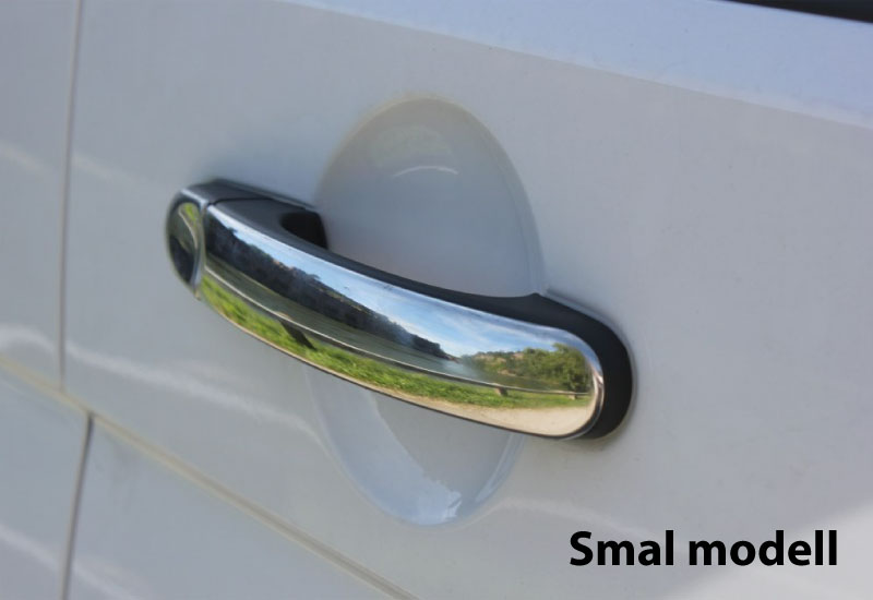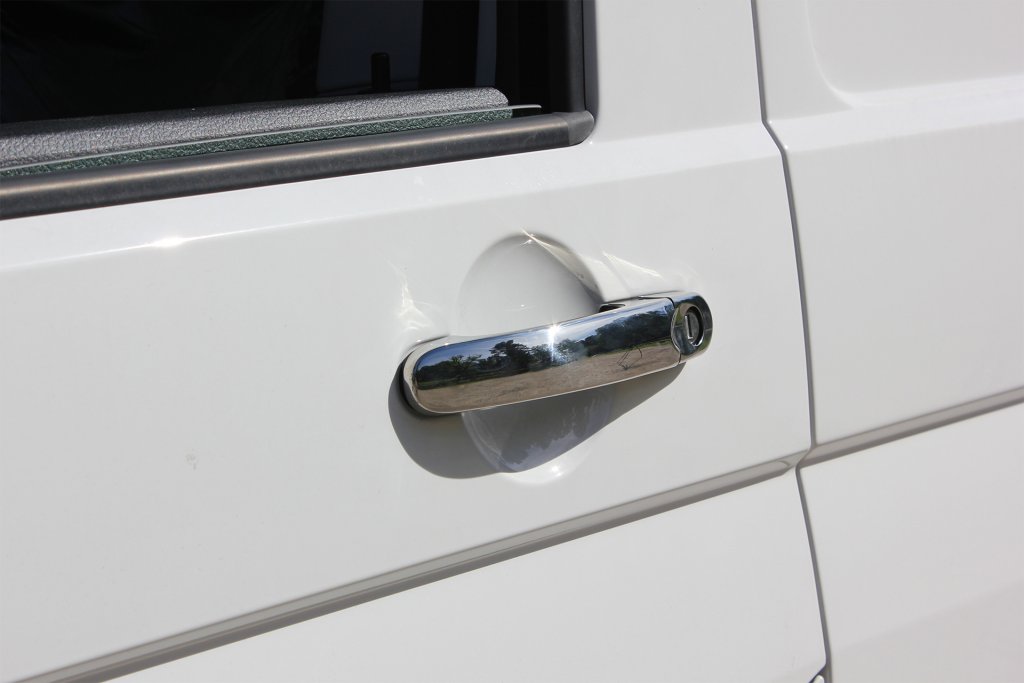 Stylish molded door handles (4 pcs) in stainless steel, which are mounted on top of original door handles on VW Transporter T5 from 2003-2015.