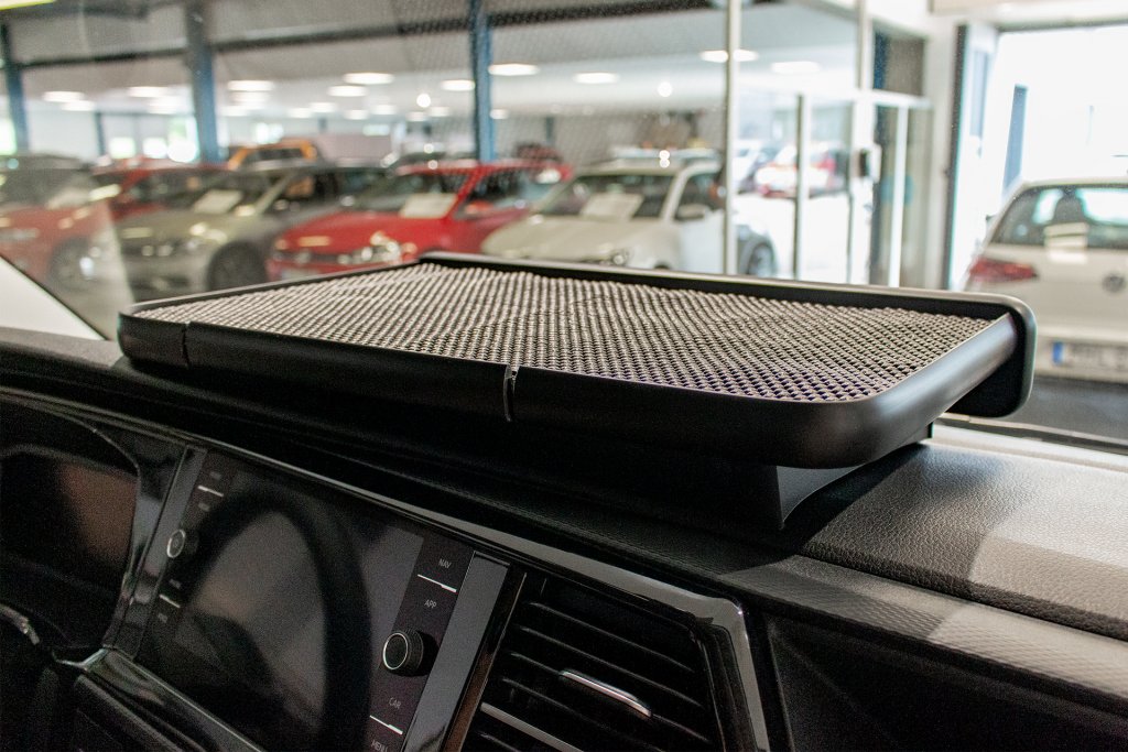 This table is specially designed to fit perfectly in your Volkswagen Transporter T6.1, providing you with a convenient surface for a more organized dashboard. The included anti-slip mat ensures your belongings stay securely in place while driving. For vehicles with an open compartment on the dashboard, the table is equipped with a hinged lid, allowing for easy access to the space underneath the table.