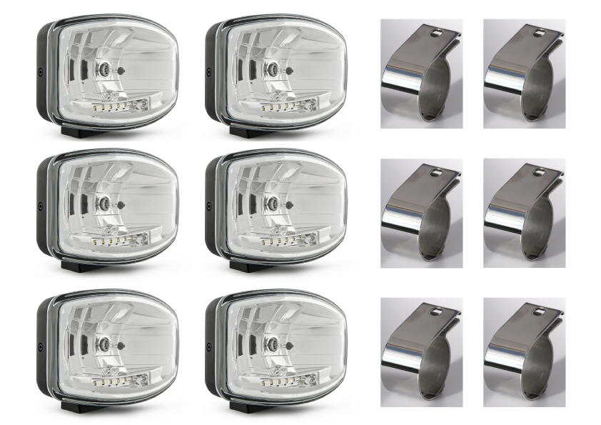 The following Extra Light Box includes 6 Hella Jumbo 320 24V. Together with the lights, we also supply six stainless steel clamp brackets, intended for your front and roof arch.