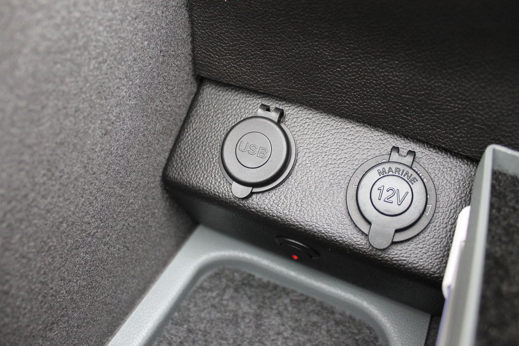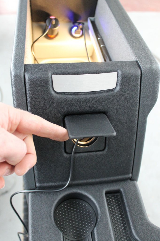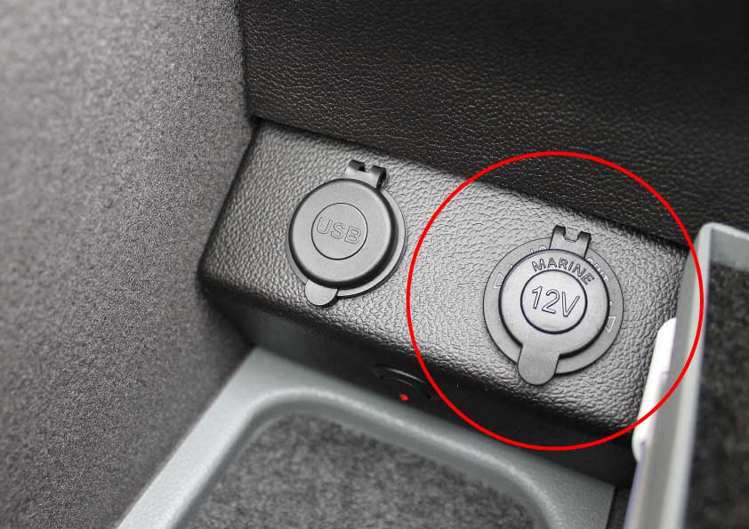 You can find similar products hereHandy 12V power socket, neatly integrated inside the center console. Through a hatch below the armrest, you can route cables to discreetly utilize the socket.