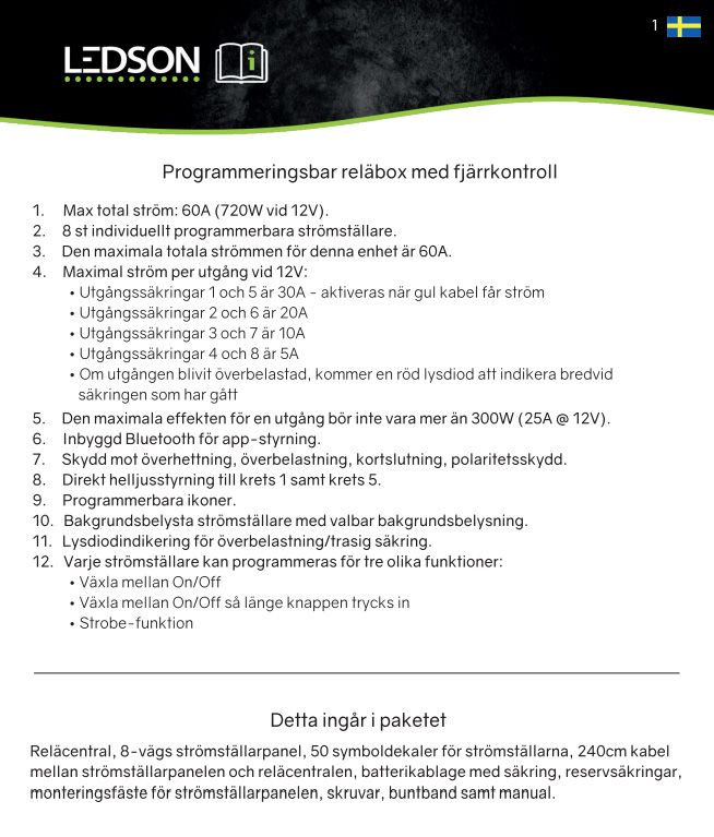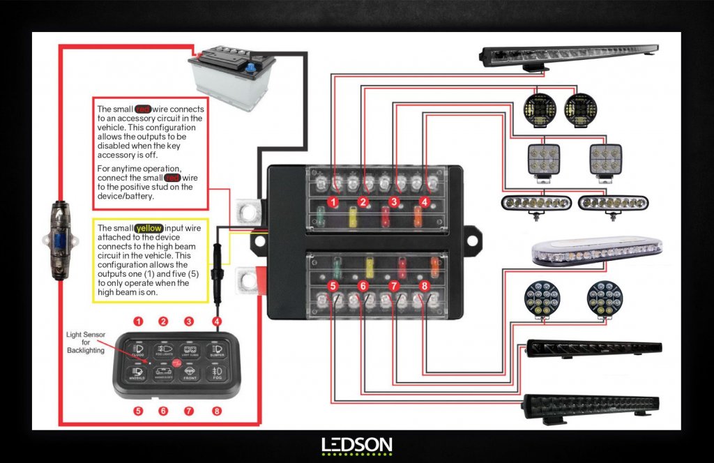 LEDSON Commander Relay Box/Electrical Control Center Gen 2 - turn on and off LED ramps, auxiliary lights, work lights, etc. or turn on and off other devices with the push of a button! Programmable control panel with 8 individual outputs, control up to 8 devices separately or together. Remote control with adjustable backlight (RGB, choose exactly the color you want!) included, with 2.5 meter cable. There is also app support with SwitchPanel for control via Bluetooth(Android and Apple).