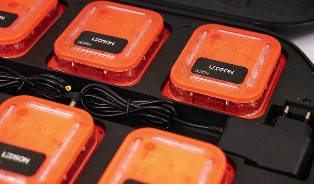 You can find similar products hereProSync LED Flare from LEDSON, a "smart" synchronizable (automatically synchronizes at start-up) warning light with angle sensor. Unlike traditional warning pucks, these devices can be synchronized with each other to get a wandering light function, a very effective way to increase visibility during accidents or road works. Synchronization also allows you to turn them all off at the same time.