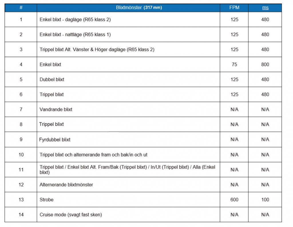 - Lightning patterns: 13 or 17, depending on length (317mm has 13, the rest have 17)
