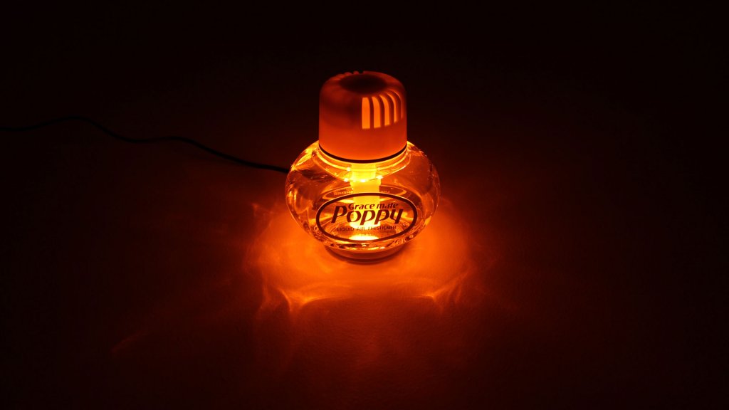 The Poppy lamp is placed under the original Grace Mate Poppy with pre-attached double-sided tape and lights up with the help of five diodes. The tape sticks both to the Poppy bottle and to the surface it stands on.
