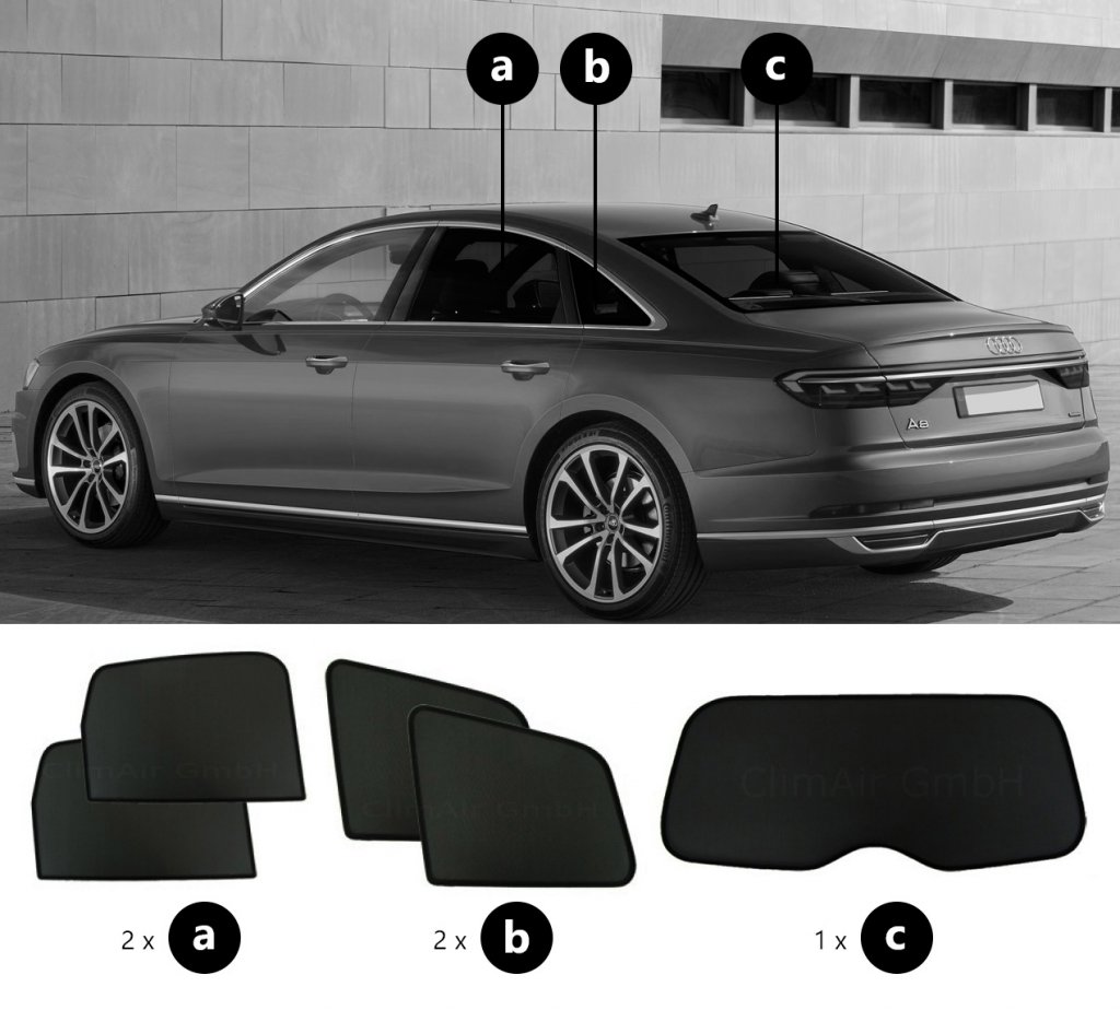 Audi A8 sun visors are supplied as a complete set for the rear doors, side windows in the boot and boot lid.