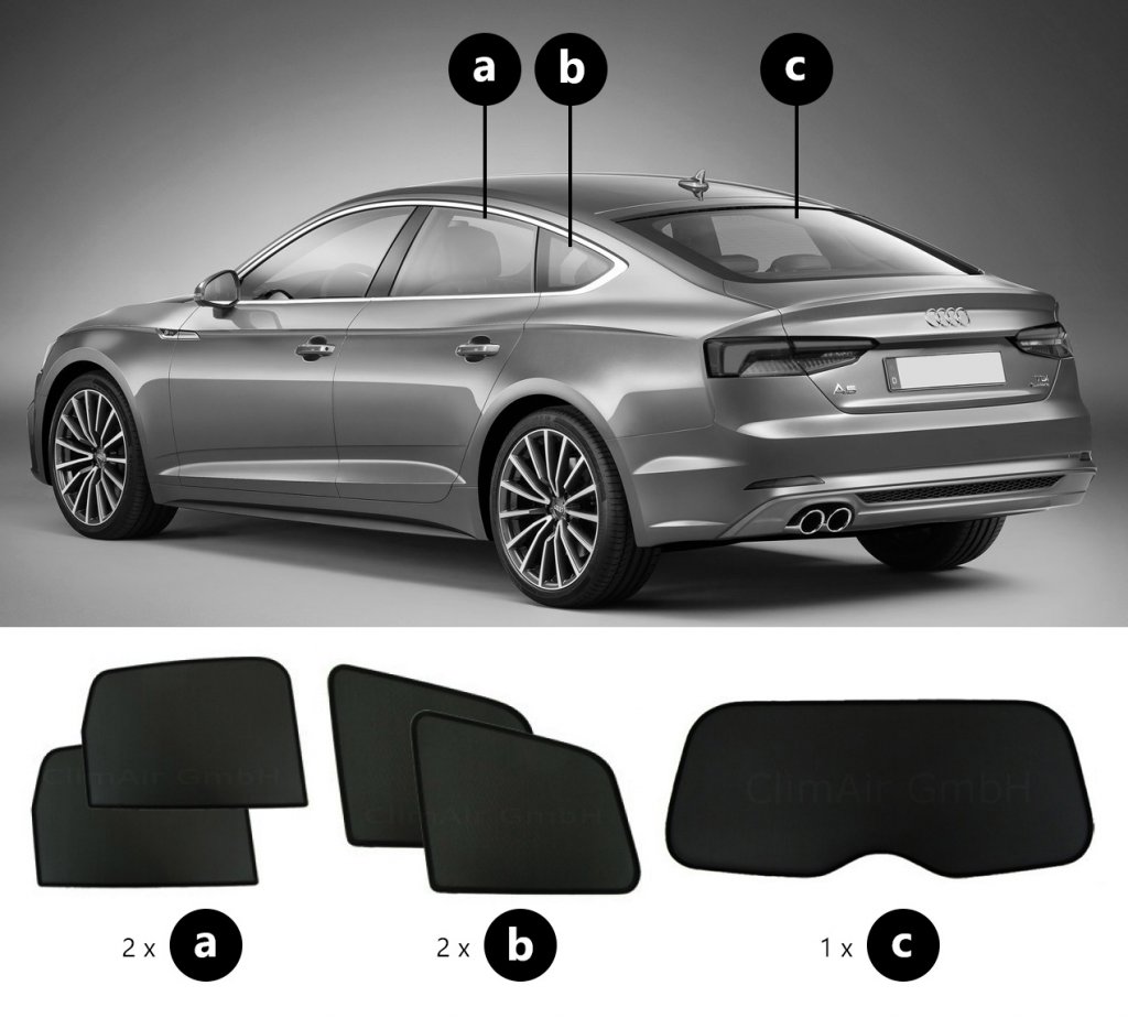 The Audi A5 sun visors are supplied as a complete set for the rear doors, side windows in the boot (Sportback only) and the boot lid.