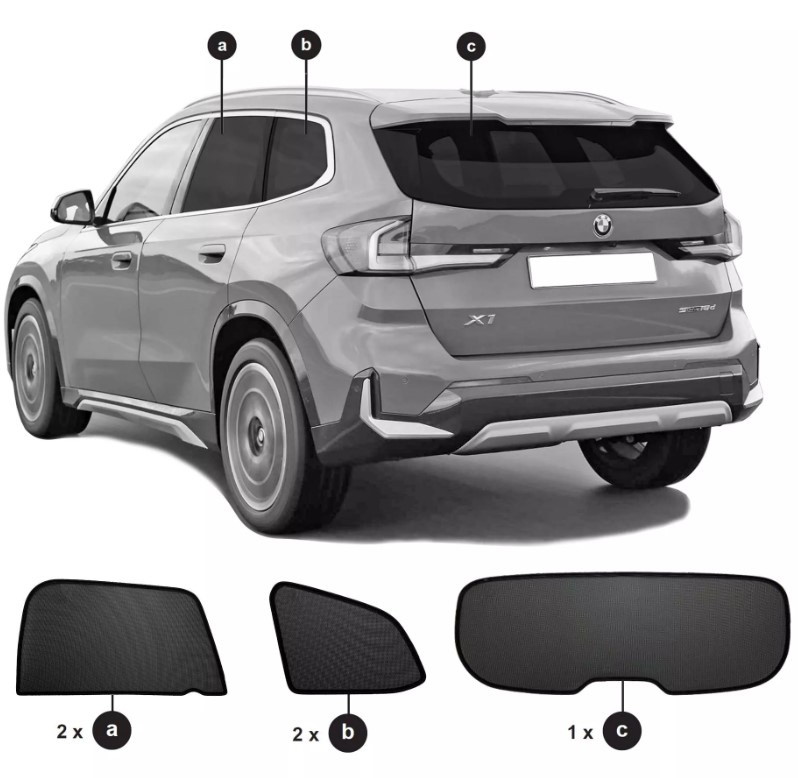 BMW iX1 sun visors are supplied as a complete set for the rear doors, boot side windows and boot lid.
