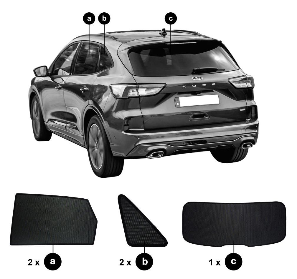 Sonniboy sun visors Ford Kuga from 2020 onwards for rear and side windows provide the best possible protection against heat and visibility in your car.