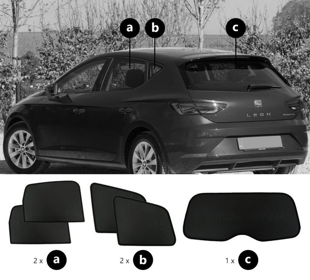 Sonniboy sun visors Seat Leon from 2013-2019 for rear and side windows provide the best possible protection against heat and visibility in your car.