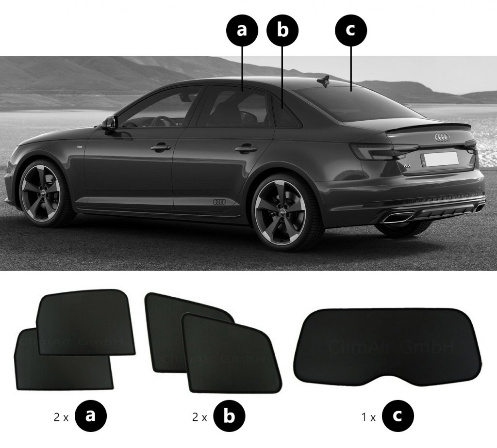 The Audi A4 sun visor is supplied as a complete set for the rear doors, side windows in the boot and boot lid.