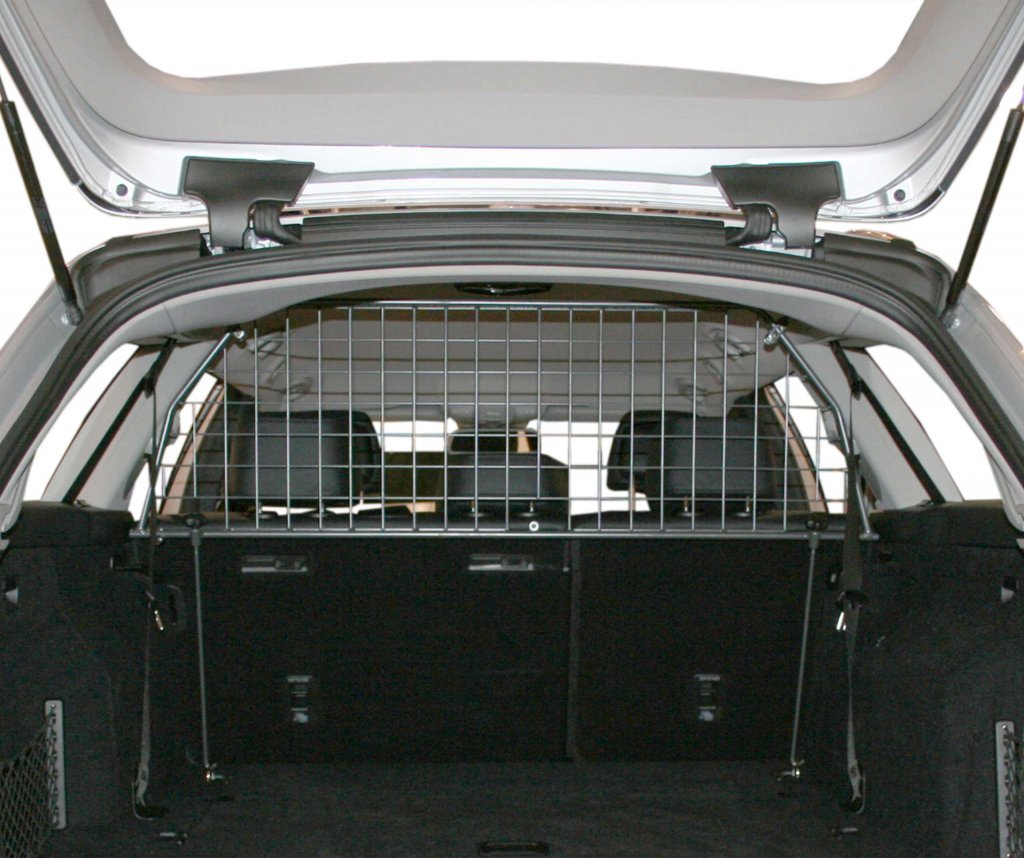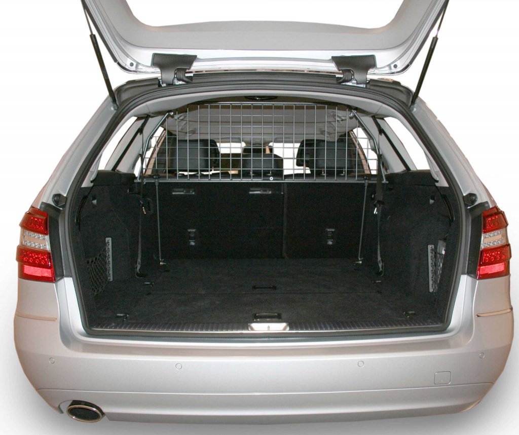 The Mercedes E class Kombi Dog Guard is installed without damaging your car. Feel safe with a secure barrier between the passenger compartment and the cargo area. Something as simple as the spare tire in your car weighs the equivalent of 1200 kg in a collision at 50 km/h, that's the equivalent of a small car flying through the cabin. A cargo net ensures that your belongings and cargo stay where they are meant to be, in the trunk.