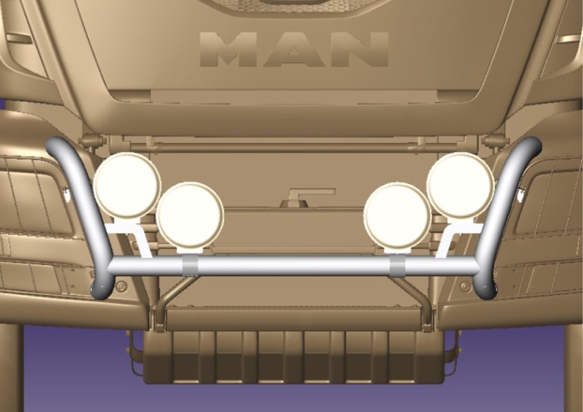In total, you can fit four auxiliary lights on the bull bar. As an option, the frame is supplied with a pre-drawn connection cable for auxiliary lights, position lights and flashing/warning lights, completely according to your specification. Contact us when ordering.