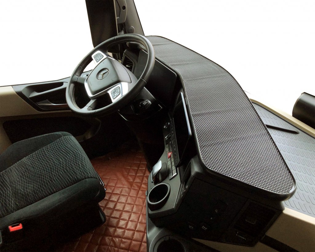 Table Mercedes Actros MP4/MP5 from 2011 and newer gives your truck extra functionality! This practical and stylish storage table is designed to be mounted on the dashboard in front of the driver's seat. Perfect for creating a stable workspace or for keeping your phone, notes and other items safe while on the road.