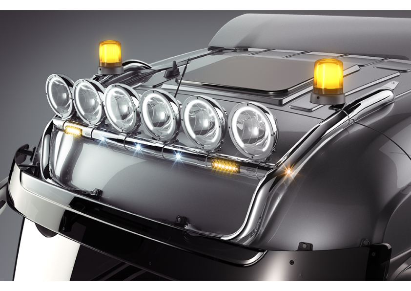 In total, you can fit six auxiliary lights and two warning lights on the roof arch. As an option, the arch is supplied with a pre-drawn connection cable for extra lights, position lights and flashing/warning lights, completely according to your specification. Contact us when ordering.