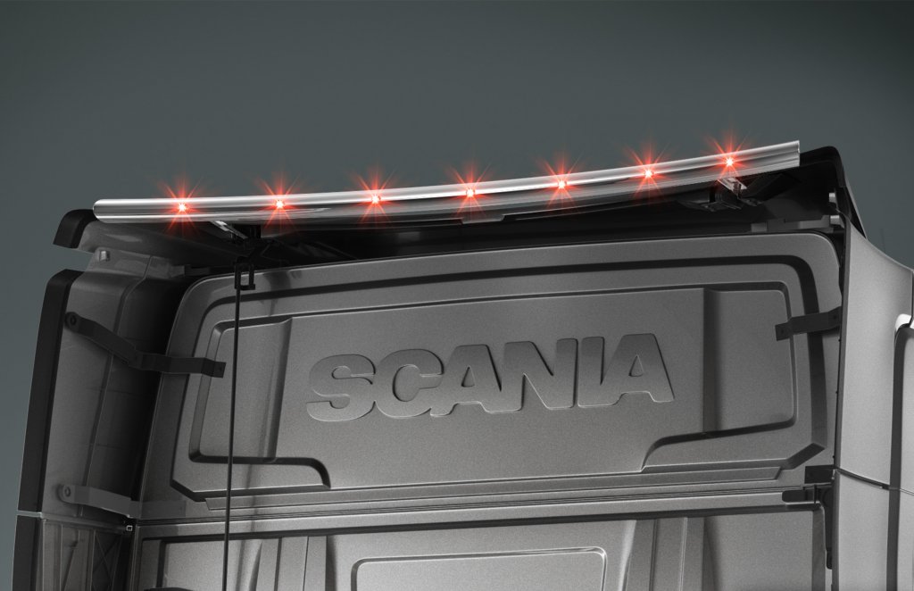 Functional work light bar for Scania R/S/G/P series C20 with Normal cab or Highline cab in stainless steel that is highly polished to a chrome shine.